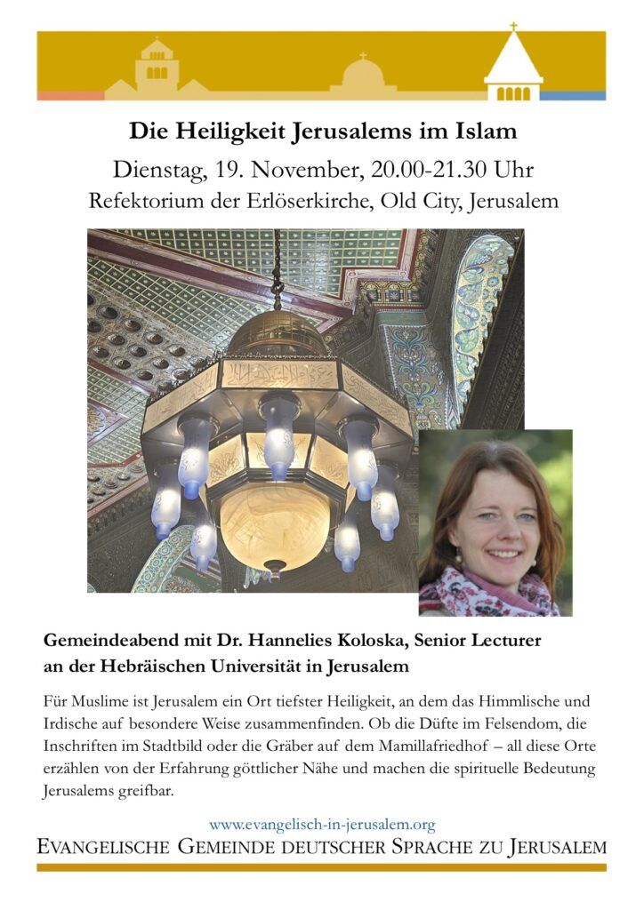 Die Heiligkeit Jerusalems im Islam Gemeindeabend mit Dr. Hannelies Koloska Tags:Altstadt, Erlöserkirche, Gemeindeabend, Islam, Jerusalem DatumDienstag, 19. November 2024Expired! Uhrzeit 20:00 - 21:30 OrtPropstei: RefektoriumMuristan St. 5, Jerusalem Altstadt