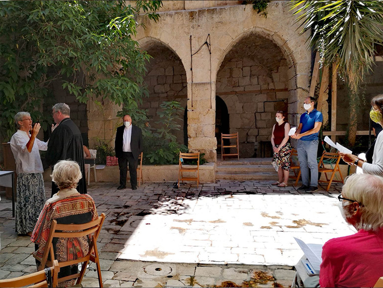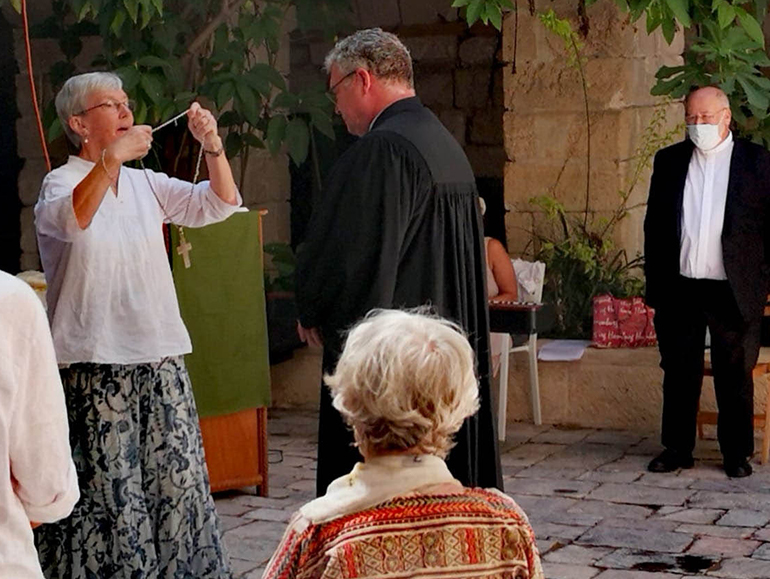 Für den Reformationstag ist eine gottesdienstliche Einführung ins Propstamt vorgesehen, zu der dann die ökumenischen Partner und die Freundinnen und Freunde von Jerusalemstiftung und Gemeinde eingeladen werden sollen. Der Fortgang der Pandemie wird ergeben, ob die Feier in diesem Jahr oder doch erst später stattfinden kann – darüber soll im September entschieden werden.Da Versammlungen in einer Kirche nur mit zehn Personen, als Open-Air-Gottesdienst aber mit 20 Menschen stattfinden dürfen, fand der Gottesdienst in Kreuzgang und Innenhof der Propstei statt. Jenseits aller gesetzlicher Vorgaben zeigte sich das als schöner, dichter Ort für den Gottesdienst.