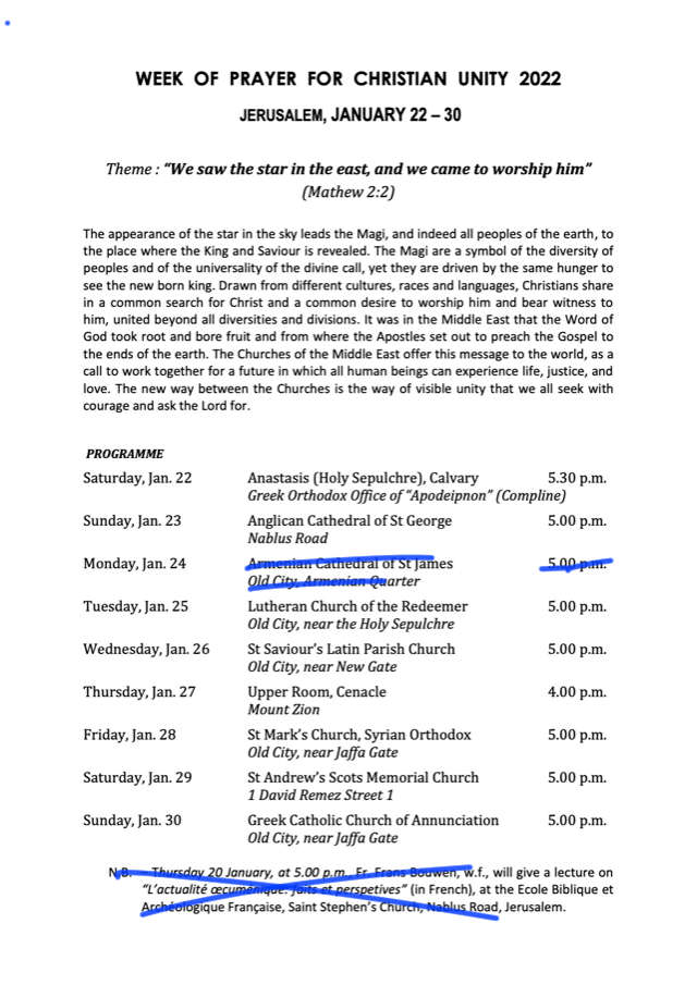 Zur »Ökumenischen Gebetswoche für die Einheit der Christen« lädt alljährlich der Weltkirchenrat ein. In Jerusalem liegt sie immer in der Woche nach dem 20. Januar, dem Weihnachtstag Armenisch-Orthodoxen Kirche — also später als sonst in der Welt.