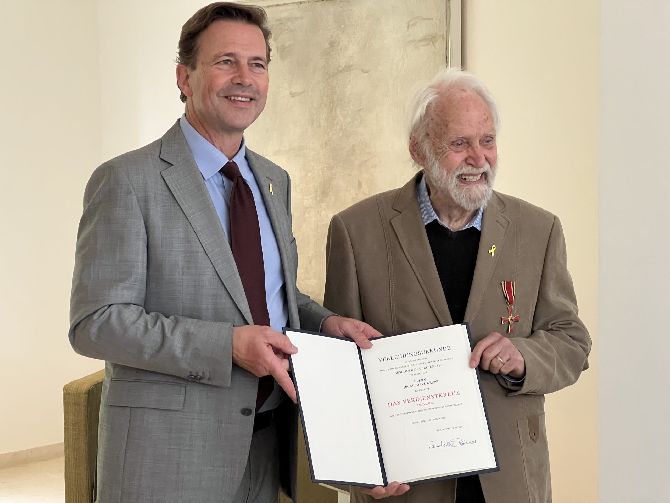 Pfarrer i. R. Michael Krupp ist heute in Herzliya, Israel, für seine vielfältigen Verdienste im christlich-jüdischen und interreligiösen Dialog und seine Aufbauarbeit des Studienprogramms „Studium in Israel“ vom Botschafter der Bundesrepublik Deutschland in Israel Steffen Seibert das Bundesverdienstkreuz am Bande verliehen worden.