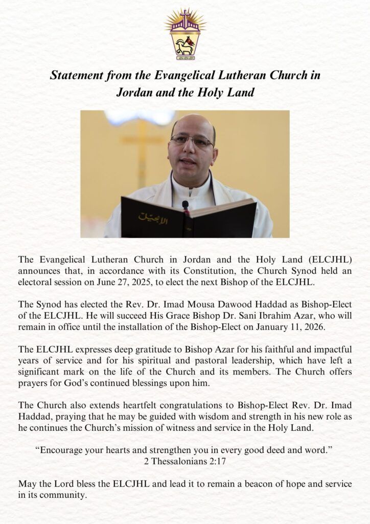 Die deutschsprachige Gemeinde in Jerusalem und in Amman gratuliert von Herzen. Wir wünschen Gottes Segen für die Zukunft – unserer palästinensischen Schwesterkirche, dem zukünftigen Bischof und seiner Familie.