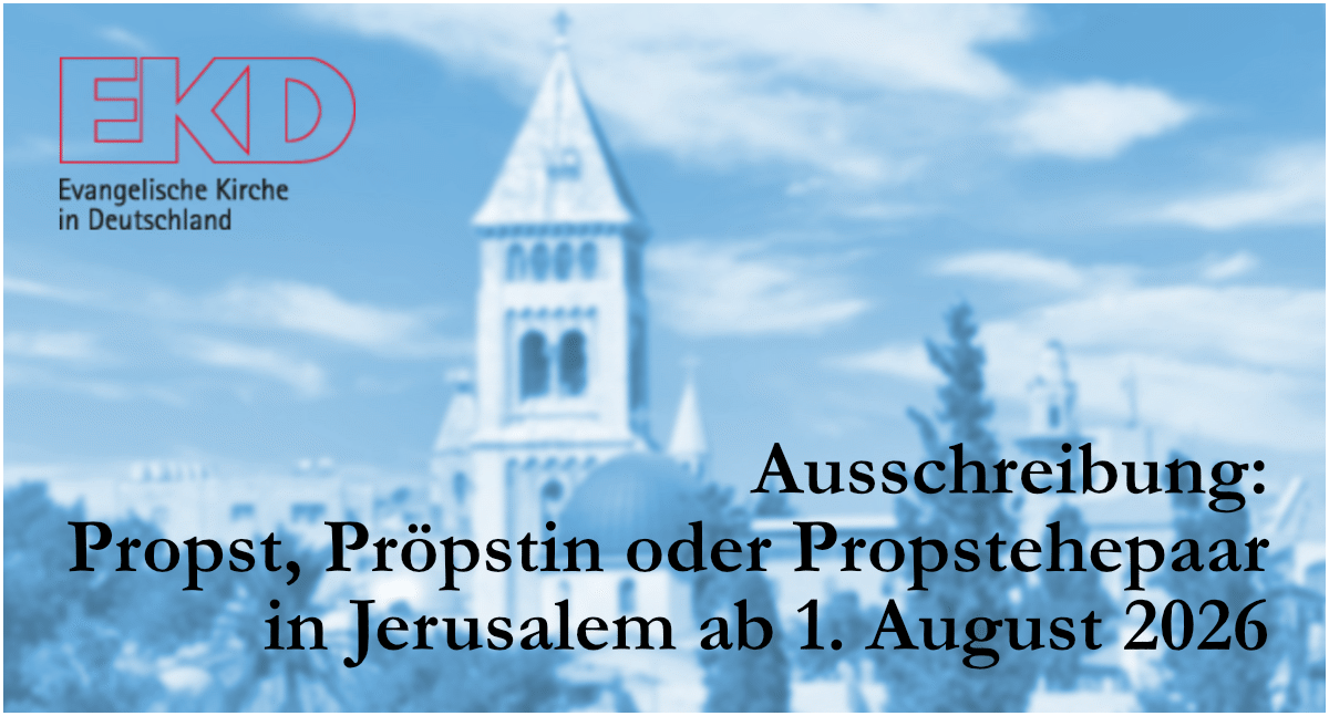 Die Evangelische Jerusalemstiftung der EKD und die Evangelische Gemeinde deutscher Sprache zu Jerusalem suchen für die Zeit ab 1. August 2026 einen Propst, eine Pröpstin oder ein Propstpaar. Bewerbungen sind bis zum 15. Oktober 2025 an das Kirchenamt der EKD zu richten.Auf die Webseite der EKD gibt es Informationen zu Aufgaben, Anforderungen und Konditionen: https://www.ekd.de/Jobborse-36.htm?jobid=334396&start=9&dist=30&churches1=132&searchtab=foreign-countries