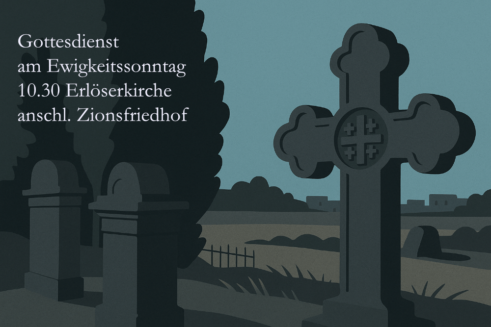 Am Ewigkeitssontag feiern wir um 10.30 Uhr Gottesdienst mit Abendmahl in der Erlöserkirche. Anschließend gehen wir zu Alten Protestantischen Friedhof auf dem Zion; dort gibt es zwei Lieder und ein Psalmgebet und die Gelegenheit, zur Ruhe zu finden und an die zu denken, die nicht mehr auf dieser Welt, aber doch im eigenen Herzen sind. …
