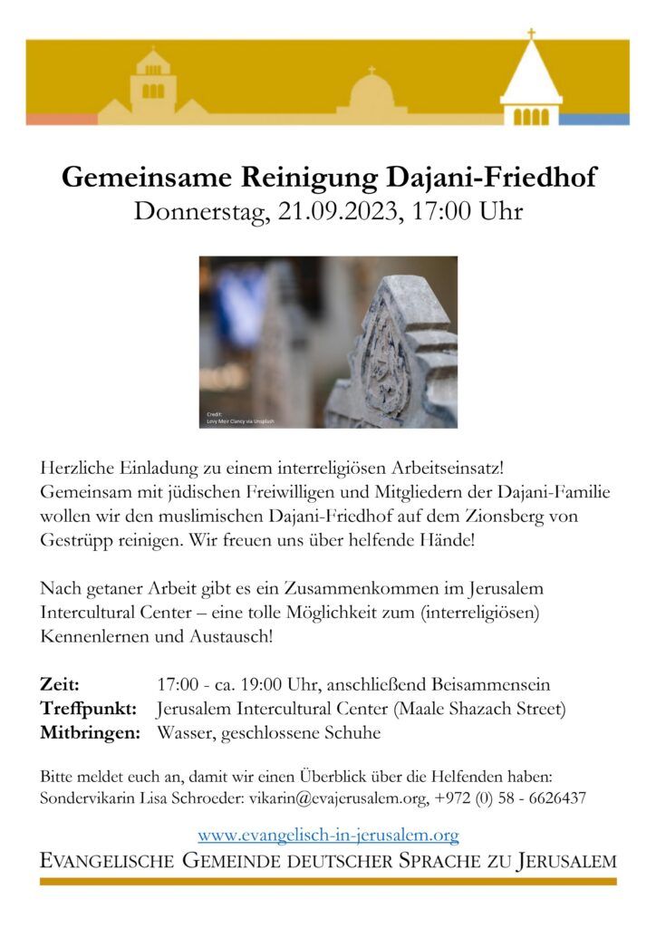 Gemeinsame Reinigung des Dajani-Friedhofsauf dem Zion Tags: Friedhof, Interreligiös, Jerusalem Date Thursday, 21. September 2023 Expired! Time 17:00 - 19:00