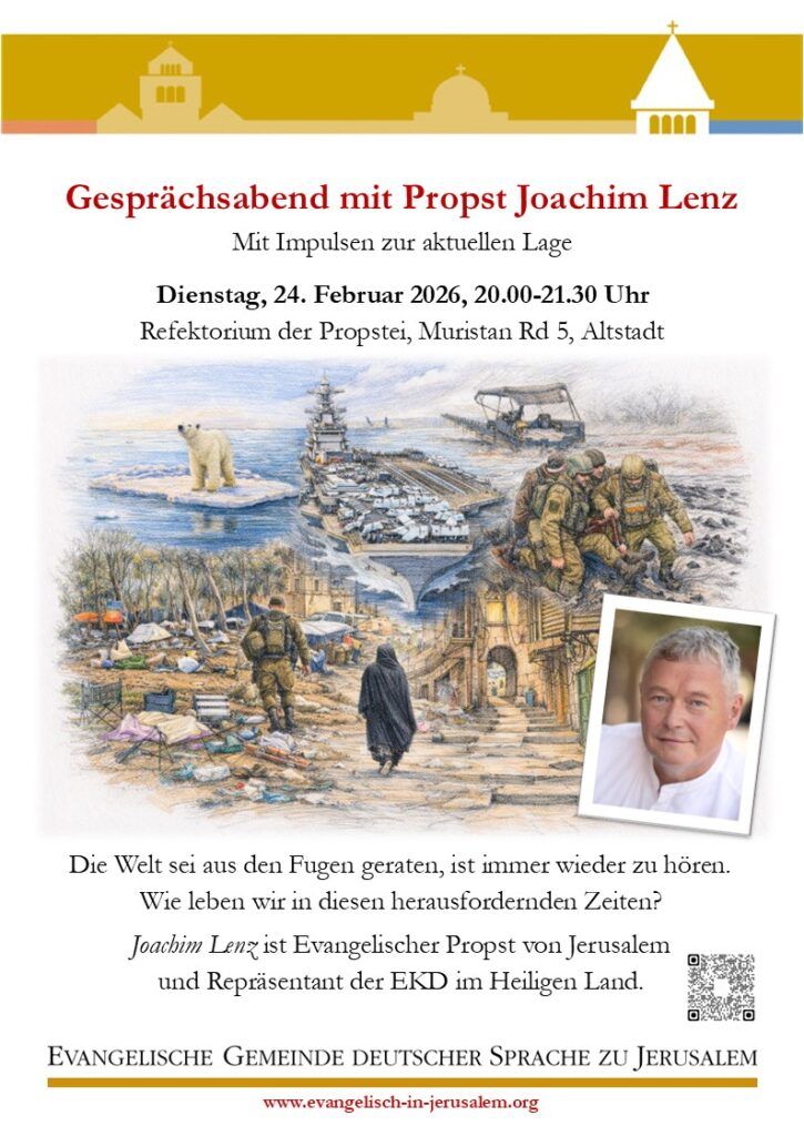 Gesprächsabend zur aktuellen Lage📓Gemeindeabend mit Propst Joachim Lenz Tags: Altstadt, Lutheran Church of the Redeemer, Gemeindeabend, Jerusalem, Propst Joachim Lenz Date Tuesday, 24. February 2026 Expired! Time 20:00 - 21:30 Location Propstei: Refektorium Muristan St. 5, Jerusalem Altstadt