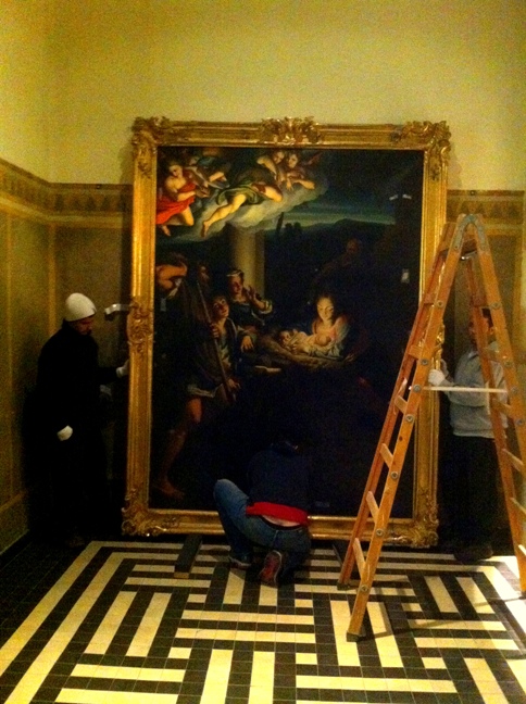 For a long time, hardly any attention was paid to a painting which hung in the eastern gallery of the Church of the Ascension and showed the Virgin Mary and her child surrounded by shepherds and farm animals. The painting is called Die heilige Nacht (The Holy Night) and was painted by Christian Wilhelm Ernst Dietrich (1712-1774). It was a copy of Italian Renaissance painter Antonio da Correggio’s (1489-1534) famous painting “La Notte”, which is on display in the Gemäldegalerie Alte Meister (Gallery of Old Masters) in Dresden. In September 2011, Israeli restorers prepared the work for shipment to Germany. The oil painting originally hung in the New Palace in Potsdam and was sent to Jerusalem as a gift from Kaiser Wilhelm II. At the beginning of 2012, it was sent to Potsdam for restoration. From April 2012, it was displayed at the exhibition “FRIEDERISIKO – Frederick the Great” in Potsdam, where it was said to be on loan from Jerusalem. The painting currently hangs in its original place, in Frederick’s Blue Room in the New Palace. It is one of the few artworks from the original interior that have survived. The King had the copy made to show off his victory over the Saxons. “This was the Prussian’s way of showing himself to be a benevolent king who was satisfied with a copy even though he could have simply used the original,” explained Dr. Alfred Hagemann, who works for the Stiftung Preussische Schlösser und Museen (Prussian Palaces and Museums Foundation).