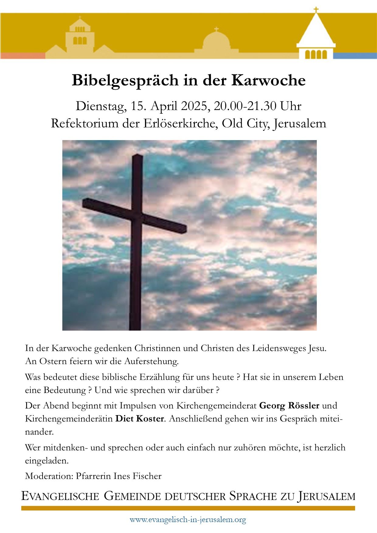 Mi, 03.09. 17.30 UhrTaizé-Andacht in der Himmelfahrtkirche: Singen – schweigen – betenMit Pfarrerin Ines FischerIm Anschluss: Beisammensein mit Abendessen im Café Auguste Victoria.Himmelfahrtkirche und Café Auguste Victoria auf dem Ölberg. Ohne Anmeldung. Sa, 06.09. 19.00 Uhr (18.00 Uhr deutscher Zeit)Friedensgebet per ZoomEinwahllink direkt: https://is.gd/y6mWZz (oder Zoom-ID: 976 8331 9026, Code: 391044)Mit Pfarrerin Ines Fischer So, 07.09. …