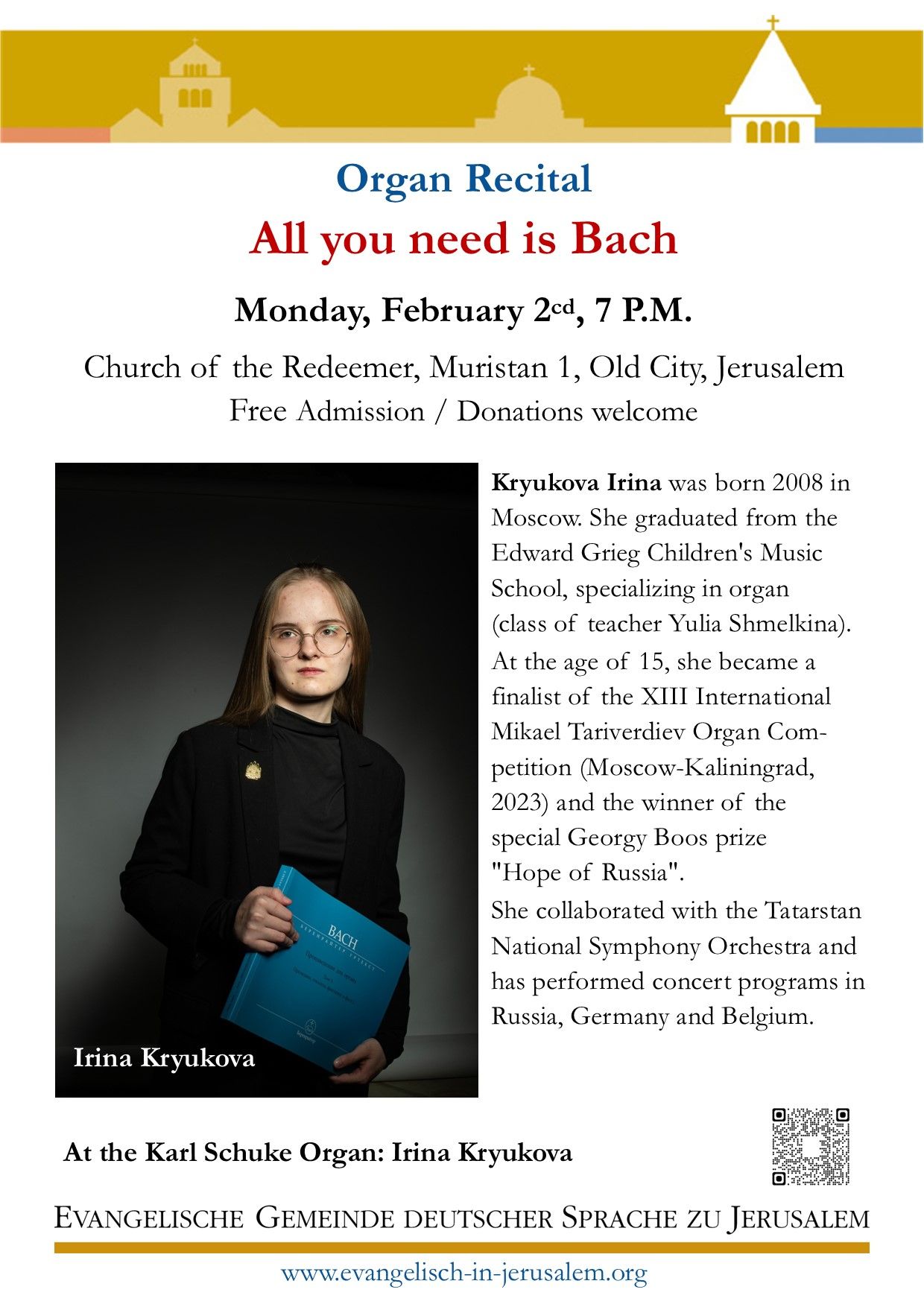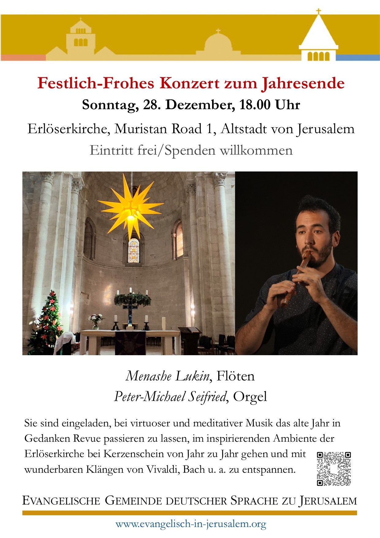 Festlich-frohes Konzert zum Jahresende Erlöserkirche, Old City Jerusalem Sonntag, 28. 12. 18:00 – Eintritt frei, Ausgangskollekte Sie sind eingeladen bei virtuoser und meditativer Musik das alte Jahr in Gedanken Revue passieren zu lassen, im inspirierenden Ambiente der Erlöserkirche bei Kerzenschein von Jahr zu Jahr gehen und mit wunderbaren Klängen von Vivaldi, Bach ua. zu entspannen. …