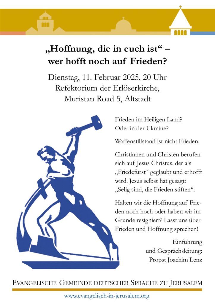 „Hoffnung, die in euch ist“ – wer hofft noch auf Frieden?Gemeindeabend mit Propst Joachim Lenz Tags:Altstadt, Erlöserkirche, Frieden, Gemeindeabend, Jerusalem DatumDienstag, 11. Februar 2025Expired! Uhrzeit 20:00 - 21:30 OrtPropstei: RefektoriumMuristan St. 5, Jerusalem Altstadt