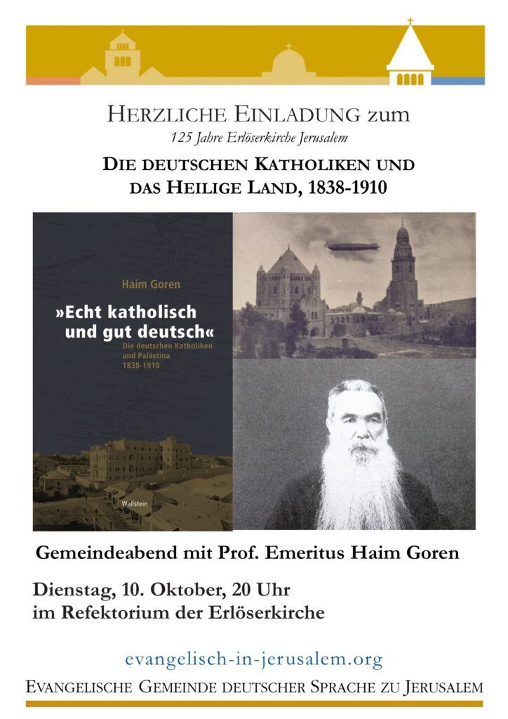 Die deutschen Katholiken und das Heilige Land, 1838-1910; Vortrag von Prof. Haim GorenEine Veranstaltung zum 125. Geburtstag der Evangelischen Erlöserkirche Jerusalem Tags:Altstadt, Erlöserkirche, Gemeindeabend, Jerusalem DatumDienstag, 10. Oktober 2023Expired! Uhrzeit 20:00 - 21:30 OrtPropstei: RefektoriumMuristan St. 5, Jerusalem Altstadt