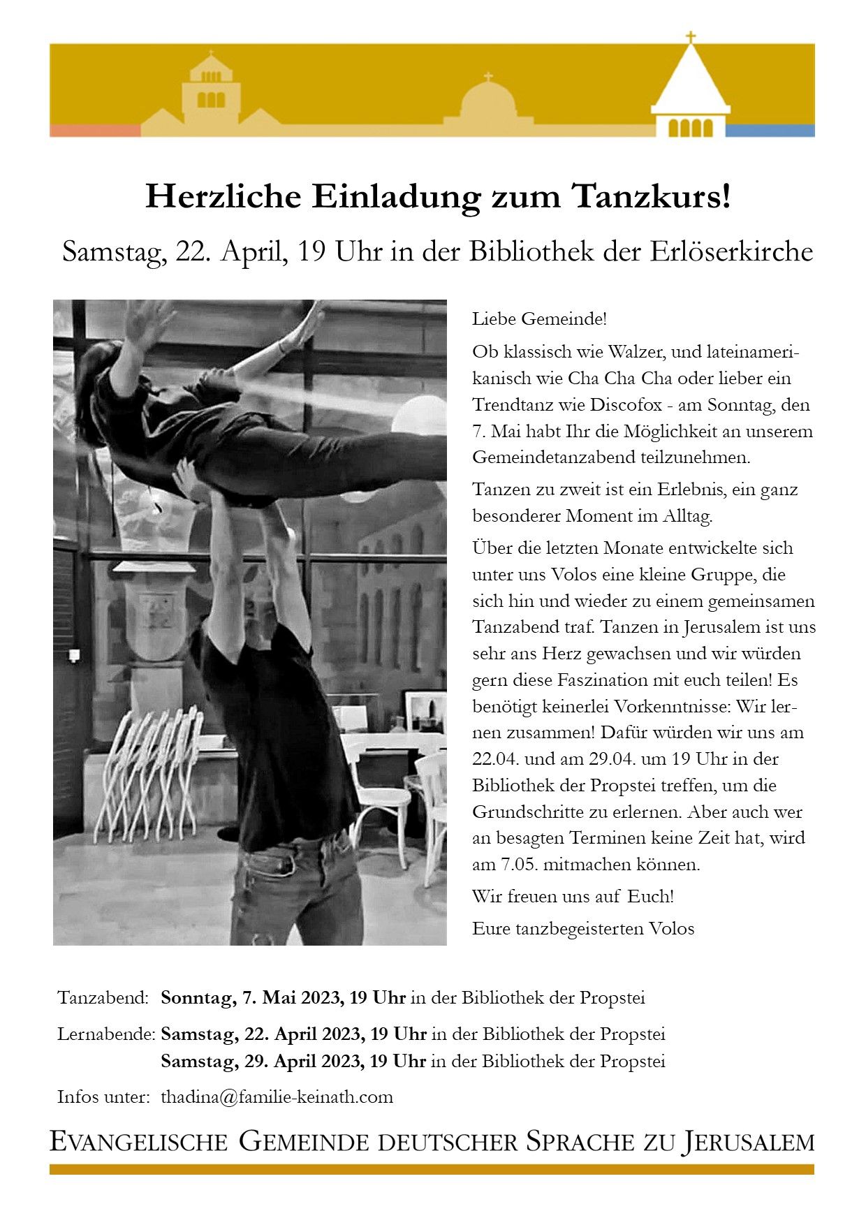 Über die letzten Monate entwickelte sich unter uns Volos eine kleine Gruppe, die sich hin und wieder zu einem gemeinsamen Tanzabend traf. Tanzen in Jerusalem ist uns sehr ans Herz gewachsen und wir würden gern diese Faszination mit euch teilen! Es benötigt keinerlei Vorkenntnisse: Wir lernen zusammen! Dafür würden wir uns am 22.04. und am 29.04. um 19 Uhr in der Bibliothek der Propstei treffen, um die Grundschritte zu erlernen. Aber auch wer an besagten Terminen keine Zeit hat, wird am 7.05. mitmachen können.