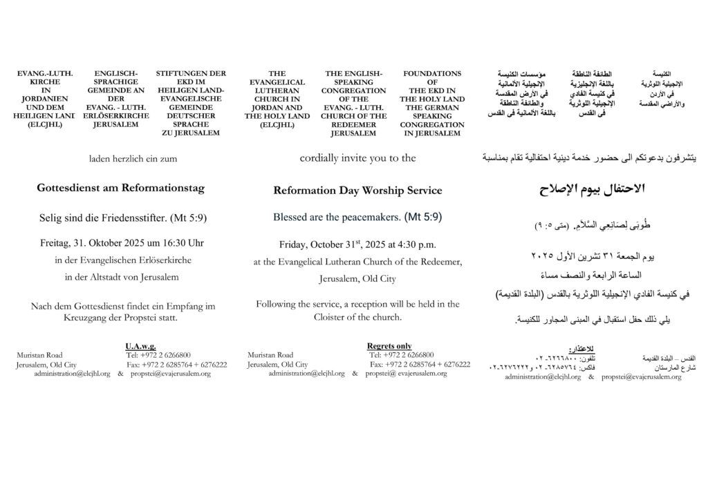 morgen, am Freitag, 31. Oktober, feiern wir um 16.30 Gottesdienst in unserer Erlöserkirche. Der Gottesdienst ist in arabischer, englischer und deutscher Sprache und wird von Menschen aus verschiedenen evangelischen, lutherischen Kirchen gestaltet. Der Bischof der Evangelisch-lutherischen Kirche in Jordanien und dem Heiligen Land, Dr. Sani Ibrahim Azar, ist in diesem Jahr unser Prediger.
