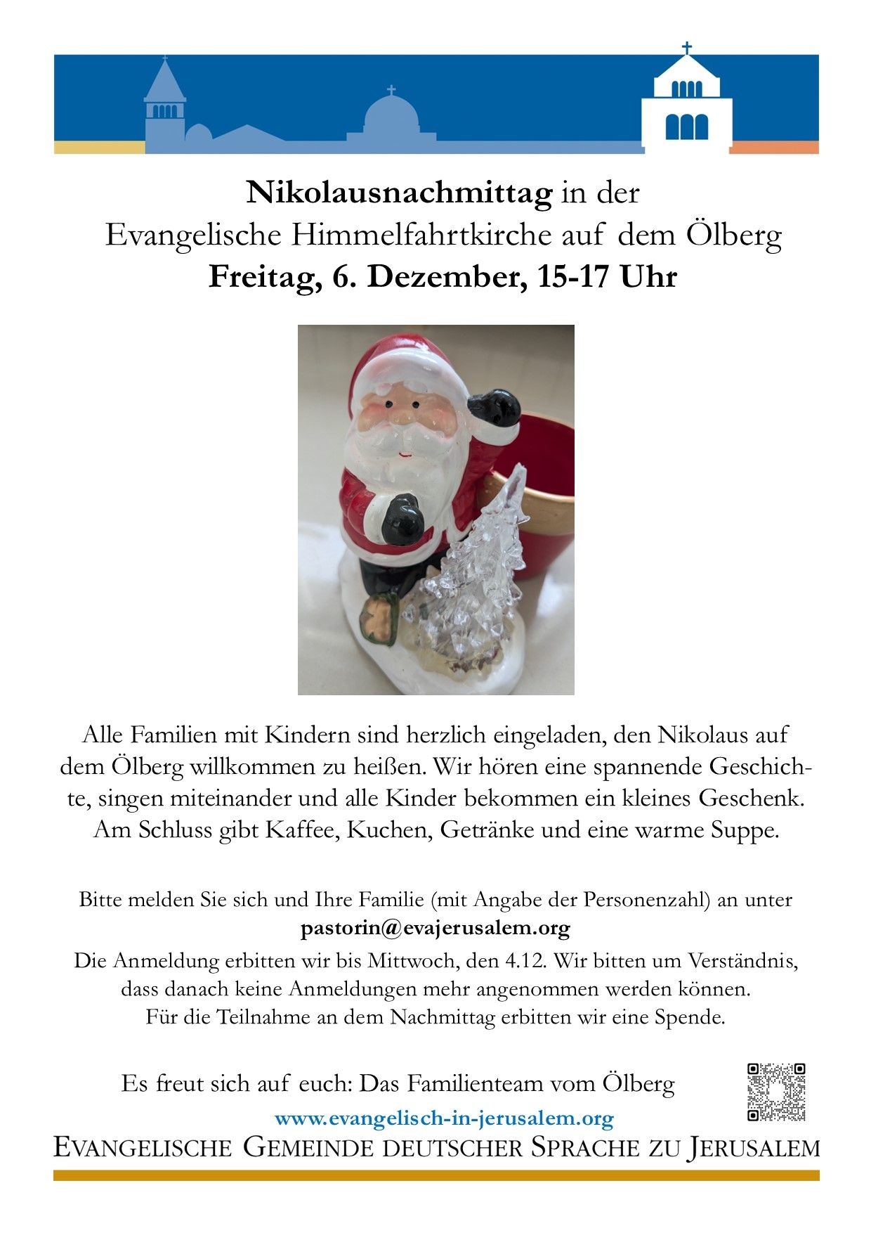 Alle Familien mit Kindern herzlich eingeladen, den Nikolaus auf dem Ölberg willkommen zu heißen. Wir hören eine spannende Geschichte, die der Nikolaus uns mitbringt, singen miteinander und alle Kinder bekommen ein kleines Geschenk. Am Schluss essen wir noch miteinander, es gibt Kaffee, Kuchen, Getränke und eine warme Suppe.