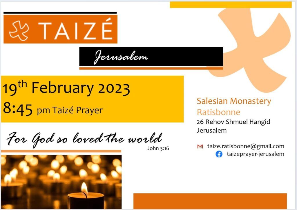An den Sonntagen 26. Februar, 5. März und 12. März lädt das Ökumenische Institut Tantur, Jerusalem, zu Taizé-Gebeten mit Br. Emile, jeweils um 17 Uhr. Im Anschluss gibt es gemeinsames Abendessen. Auch diese Einladungen geben wir gern weiter.
