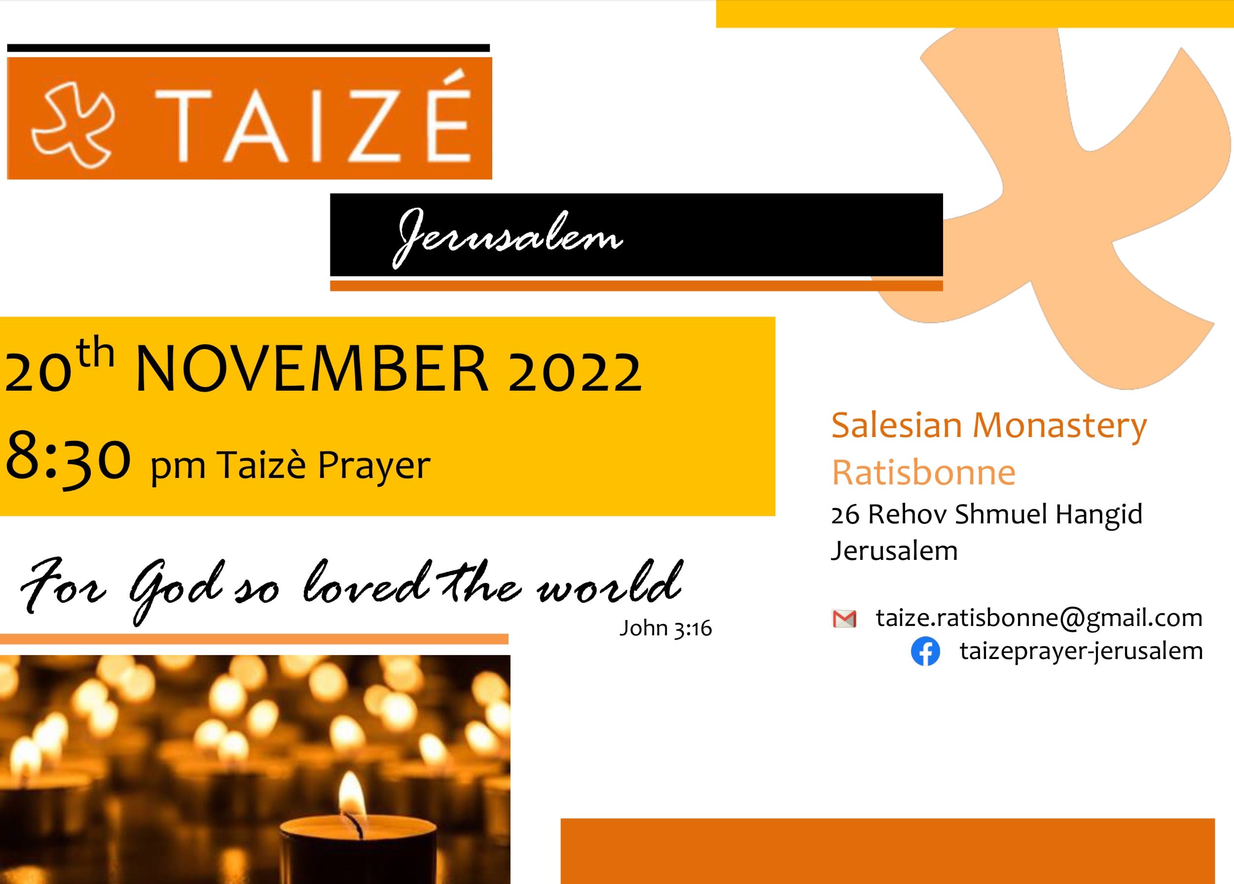 Taizé-Gebet bei den Salesianernim Kloster Ratisbonne, 26 Rehov Shmuel Hangid DatumSonntag, 20. November 2022Expired! Uhrzeit 20:30 - 21:30