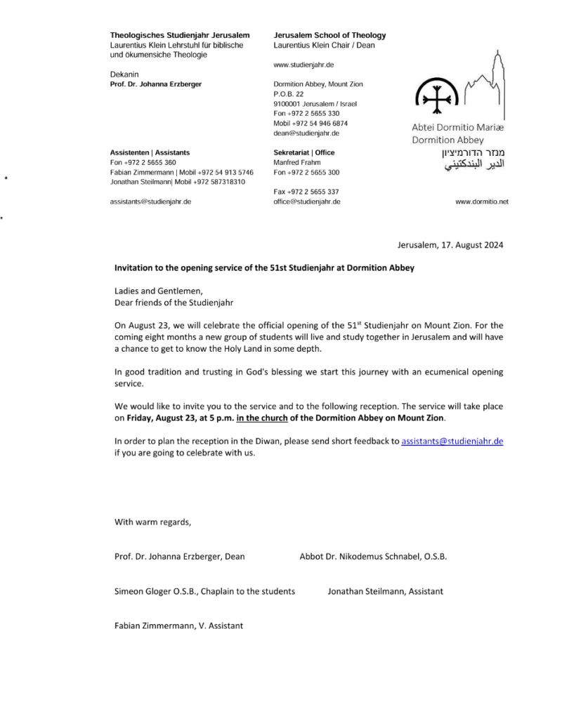 Eröffnungsgottesdienst des 51. Theologischen Studienjahres DatumFreitag, 23. August 2024Expired! Uhrzeit 17:00 - 18:00 OrtDormitio-Abtei auf dem ZionDormitio-Abtei