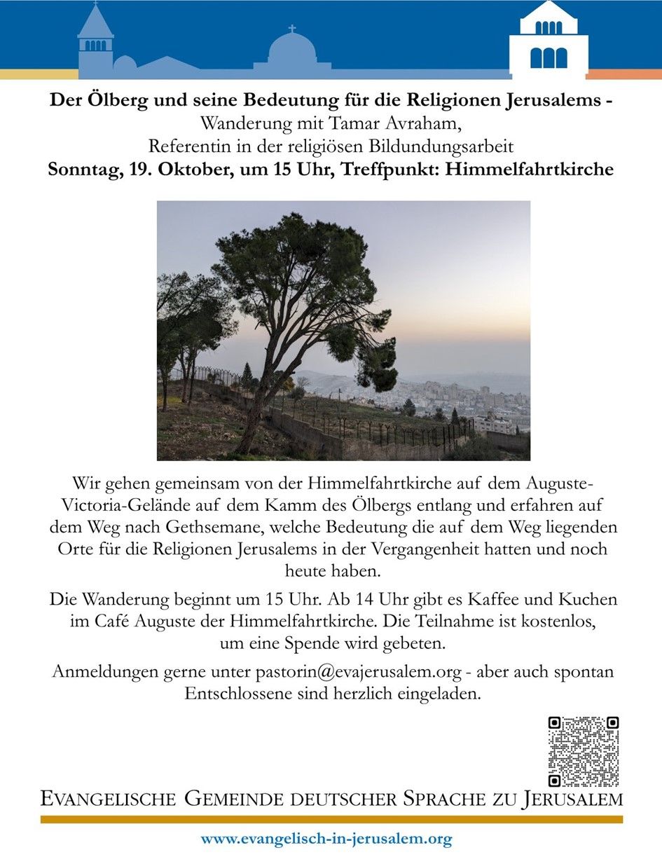 Wanderung über den ÖlbergMit Tamar Avraham, Referentin in der religiösen BildungsarbeitTreffpunkt: Himmelfahrtkirche, ÖlbergAnmeldung unter pastorin@evajerusalem.org