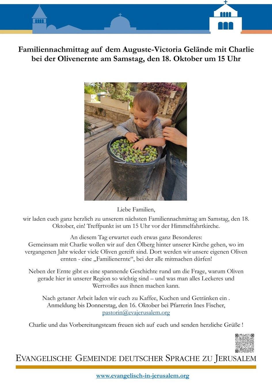 Alle Familien mit Kindern sind herzlich eingeladen zu einem Nachmittag, an dem Charlie lernt, was man mit Wasser alles machen kann und warum es so wichtig ist. Im Anschluss basteln wir noch miteinander und enden mit einem gemeinsamen Kaffeetrinken.Bitte melden Sie sich und Ihre Familie (mit Angabe der Personenzahl) an unter pastorin@evajerusalem.orgDie Anmeldung erbitten wir …
